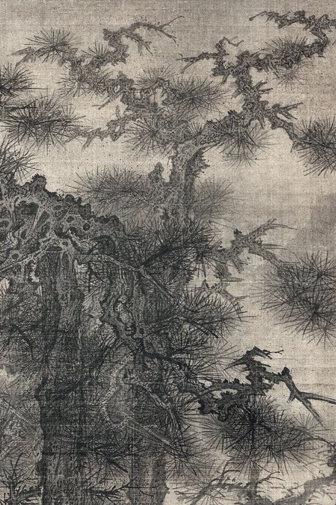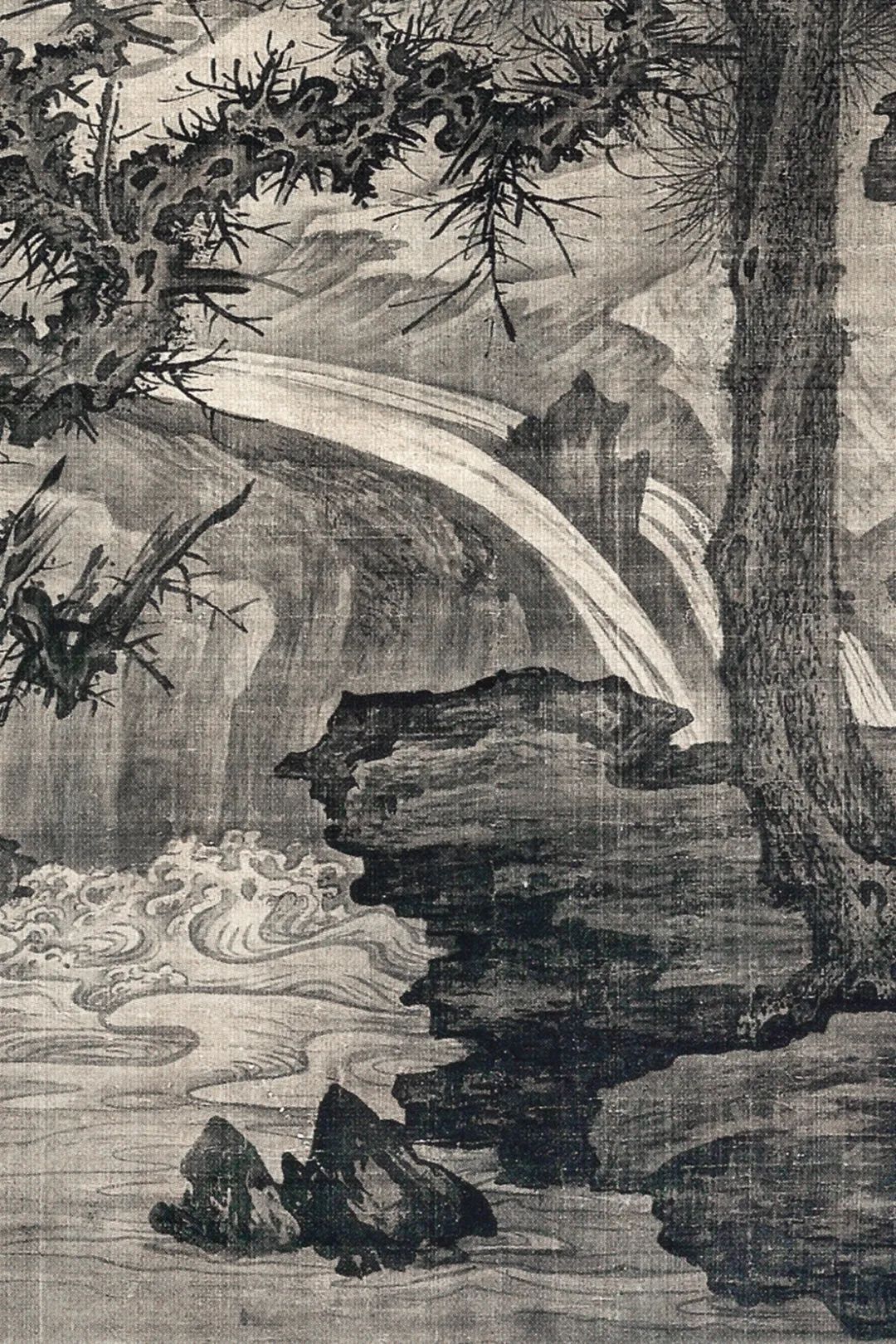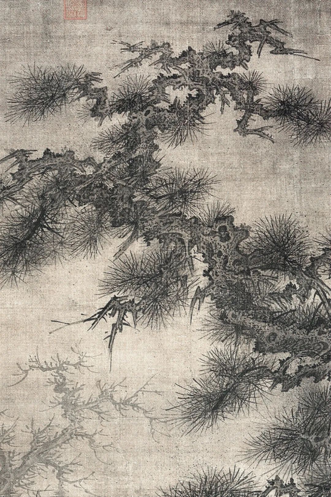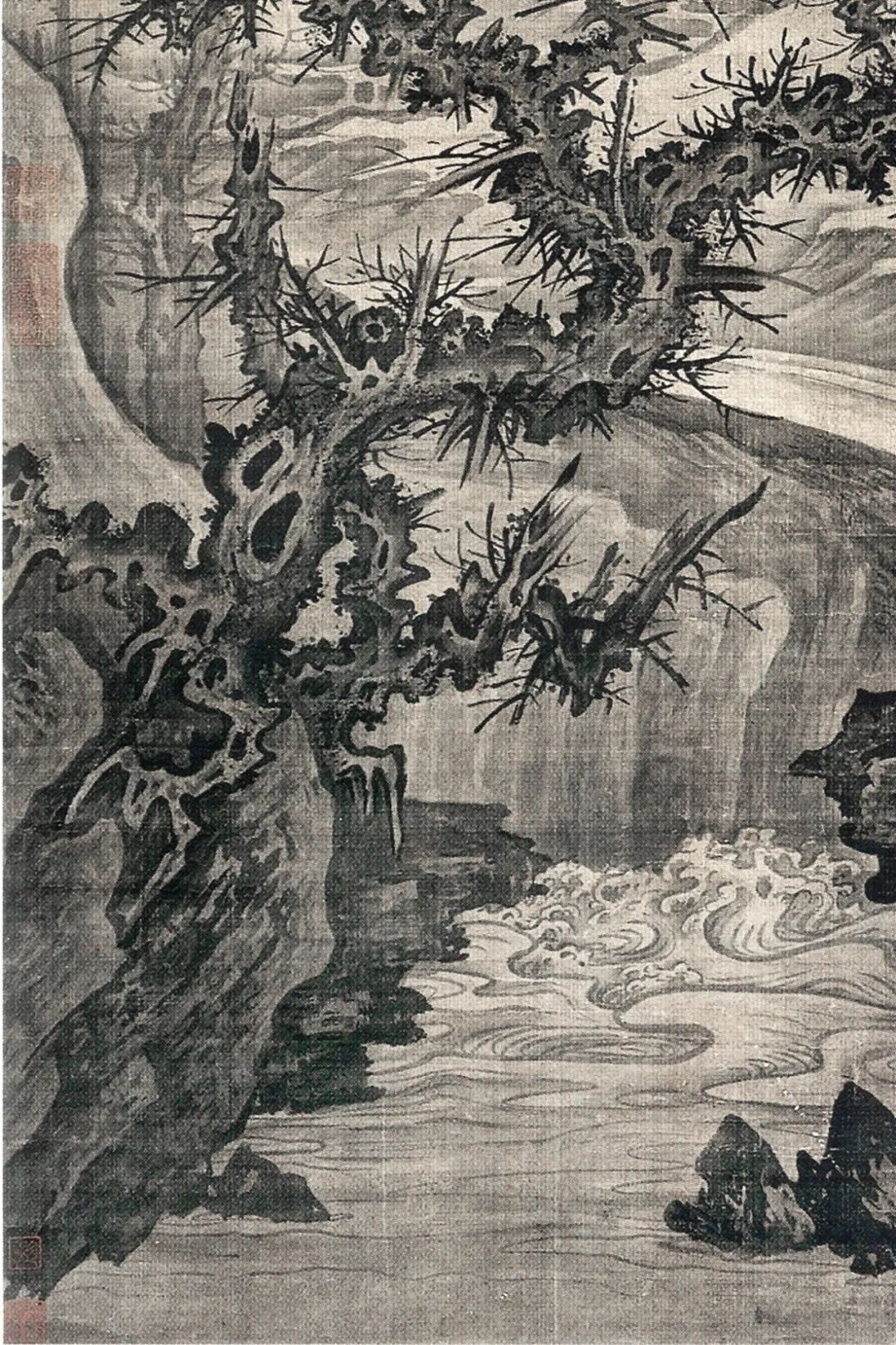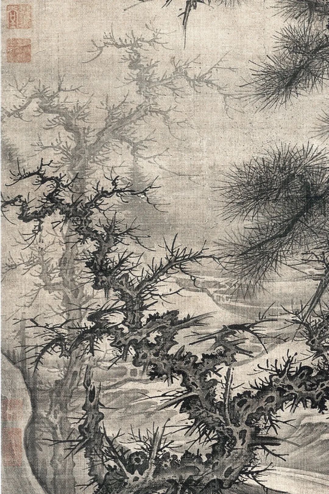 飞泉激漱于涧石之间,下潴成窟,浪花腾溅。两松劲挺立於涧右,树身误解,多瘤杈枒。松针作圆形,先用浓墨画,再用淡墨罩一次,又用墨水烘渍,临了用小弹弓弹墨花于其上,如宋东说念主弹雪法。涧左枯树两株,较两松更甚,画小枝用李郭蟹爪。树后层滩叠渚,愈远愈淡,上接烟霾天宇,一门浑囵。松身结体,颇似武元直赤壁图卷;烘染厚润,颇似李山风雪杉松图卷。